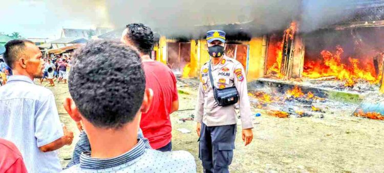 Sijago merah dengan cepat melahap bangunan yang berdampingan sehingga api cepat meluas dan melalap 7 (tujuh) ruko yang ada. Untuk memadamkan api tersebut Petugas TNI-Polri dan dibantu 6 (enam) buah mobil tangki air serta di bantu warga setempat, saling bahu membahu untuk memadamkan api. Petugas berusaha memadamkan api dengan maksud agar api tidak merambat ke bangunan lainnya.