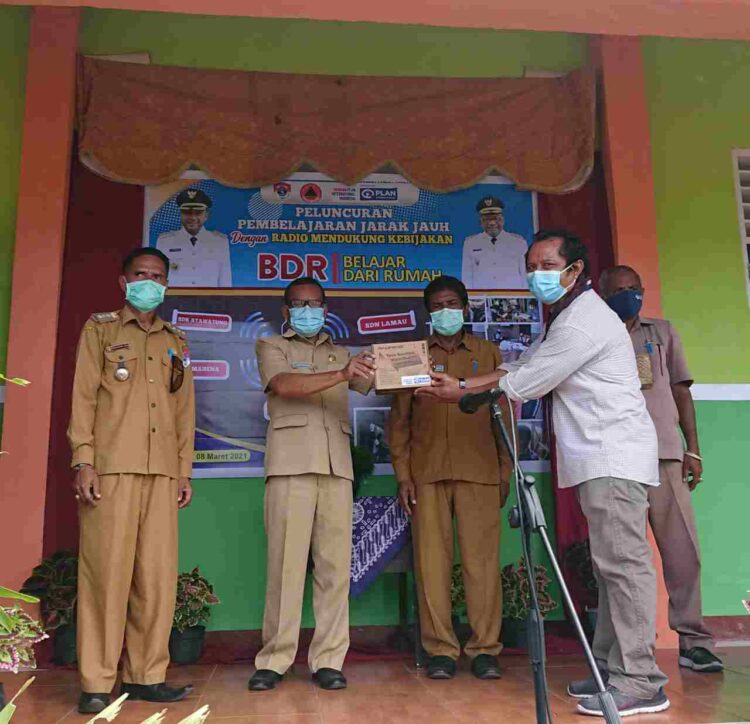 PLAN Internasional-Indonesia Program Implementasi Area (PIA) Lembata merespon kebijakan pemerintah Lembata atas kebijakan Belajar Dari Rumah (BDR) akibat pandemi Covid-19 dan keterbatasan jaringan internet dengan memberikan Handy Talkie (HT) ke lima sekolah di wilayah gugus 1 Kecamatan Ile Ape Timur, Kabupaten Lembata, Senin (08/03/2021).