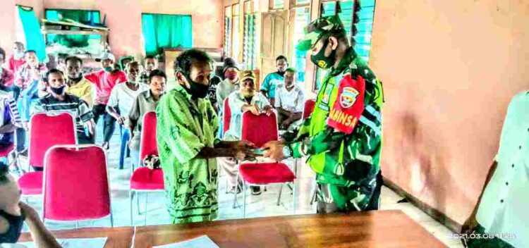 Babinsa Koramil 01/Larantuka Prada Adrianus Bapa Liwun melaksanakan pendampingan serta pengamanan penyaluran BLT DD Tahap I kepada warga terdampak Covid-19, bertempat di Aula Desa Sinar Hadigala, Kecamatan Tanjung Bunga Kabupaten Flotim, Pada Kamis (11/03/2021).