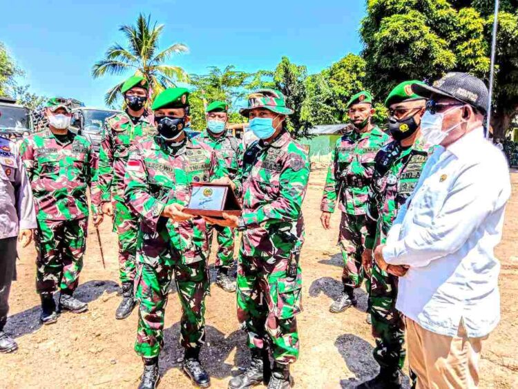 Personil Satgas Yonzikon 14/SWS dilepas Danrem 161/Wira Sakti, Brigjen TNI, Legowo W.R. Jatmiko di halaman Koramil 1624-02/Adonara, di Pulau Adonara, Pada Sabtu, (01/05/2021) pagi.