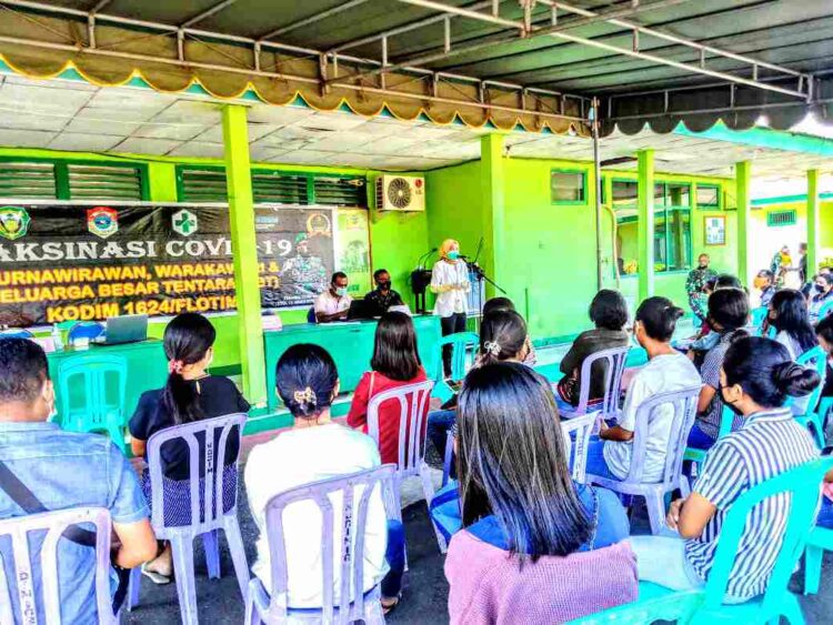 LIDIK NEWS.COM | FLOTIM – Sebanyak 101 orang terdiri dari Keluarga Besar TNI dan anak berusia di atas 18 tahun dari keluarga prajurit TNI di Komando Distrik Militer (Kodim) 1624/Flotim, mulai menjalani vaksinasi COVID-19, Pada Sabtu (05/06/2021). Penyuntikan vaksin yang berlangsung di Makodim 1624/Flotim, jln. Udayana No. I, Kelurahan Lokea, Kecamatan Larantuka, Kabupaten Flotim untuk mendukung program “Serbuan Vaksinasi” bagi keluarga besar prajurit TNI.