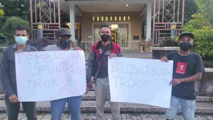 LIDIK NEWS.COM | MAUMERE –  Sekelompok masyarakat yang berjumlah kurang lebih 10 orang di Kabupaten Sikka mendatangi Istana Keuskupan Maumere pada Kamis (24/03) sekitar pukul 17.00 WITA. Mereka membawa serta dua baliho yang masing-masingnya bertuliskan “Bubarkan Truk-F” dan “Kembalikan Fungsi Truk-F”.