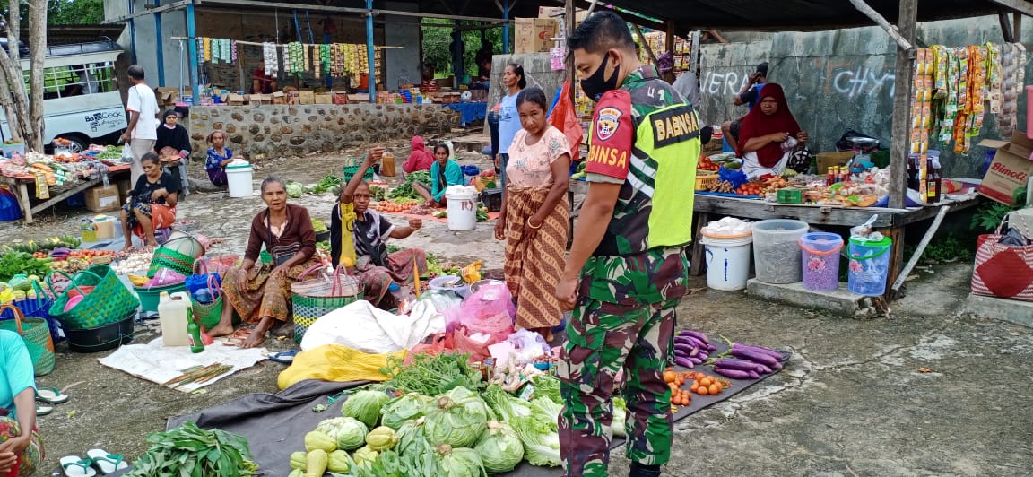LIDIK NEWS.COM | LARANTUKA – Serda Edison dan Praka Herjan selaku Babinsa Koramil 1624-05/Solor wilayah Kodim 1624/Flotim melaksanakan komunikasi sosial dan turun ke pasar tradisional kowo bertempat di Desa Leograran, Kecamatan Solor Selatan, Kabupaten Flores Timur. Senin (04/07/2022).