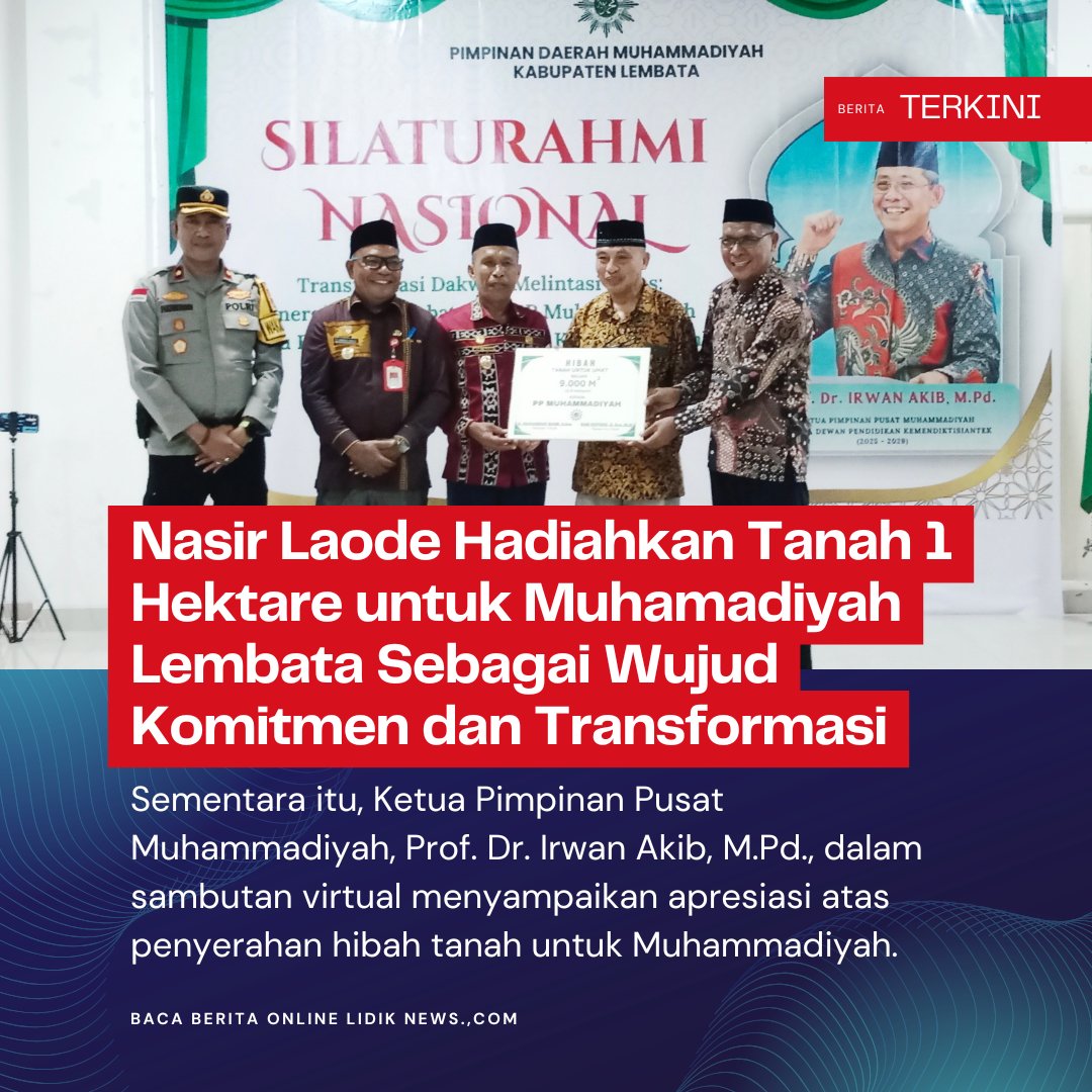LIDIK NEWS. COM | LEMBATA ~ AGENDA penting silaturahmi nasional Muhamadiyah di Kabupaten Lembata Provinsi Nusa Tenggara Timur Wakil Bupati Lembata M. Nasir Laode hadiahkan tanah pribadinya kurang lebih 1 hektare (9000 m²). Hal ini sebagai wujud komitmen dan tranformasi bersama Muhamadiyah di Kabupaten Lembata.