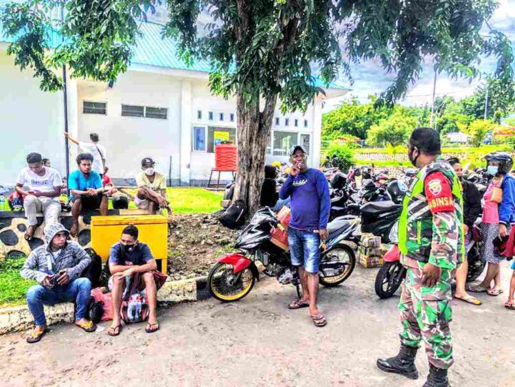 Babinsa Kelurahan Waibalun Koramil 01/Larantuka Kodim 1624/Flotim melakukan agenda penertiban pengawasan, pengamanan dan pencegahan penyebaran Covid-19 yang diterapkan dalam pelaksanaan protokol kesehatan di moda transportasi angkutan laut wilayah Kelurahan Waibalun Kabupaten Flotim, Pada Sabtu (27/02/2021) pagi.