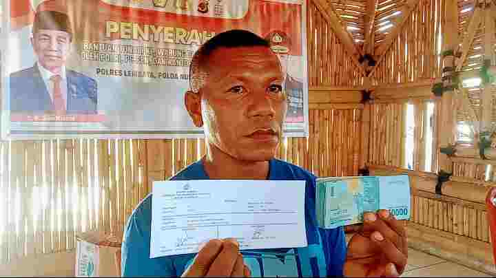 Keterangan Foto : Andreas Mowin (Nelayan) penerima bantuan uang tunai Rp.600.000., di taman baca Polres Lembata
