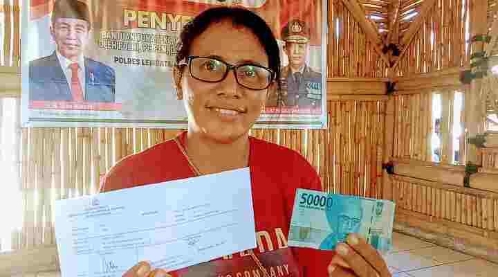 Keterangan Foto: Ibu Mariah Carvalo (Pedagang Kaki Lima) penerima bantuan uang tunai Rp.600.000.,di taman baca Polres Lembata