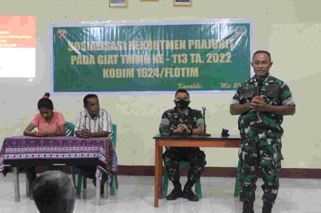 LIDIK NEWS.COM | LARANTUKA – TMMD ke-113, Pgj Pasi Ter Letda Inf Stanis Koten melaksanakan kegiatan Sosialisasi Rekrutmen Prajurit TNI AD kepada masyarakat yang berada di Kec. Demonpagong Kab. Flotim, yang dilaksanakan di Aula Kecamatan, pada Minggu (22/05/2022).