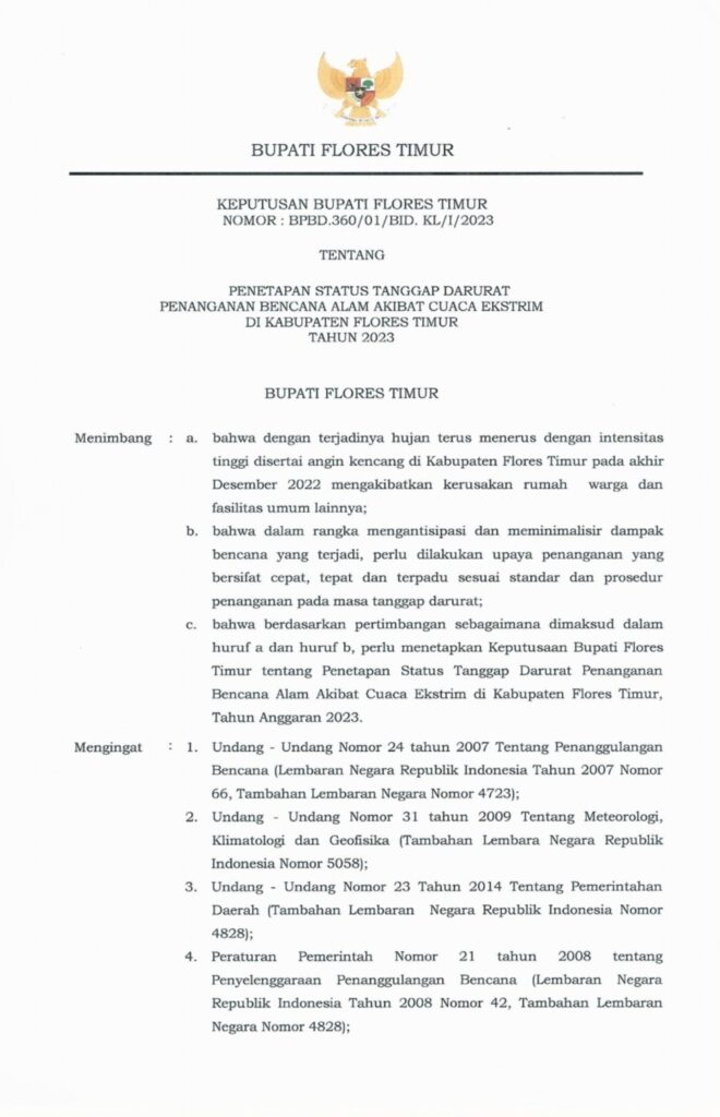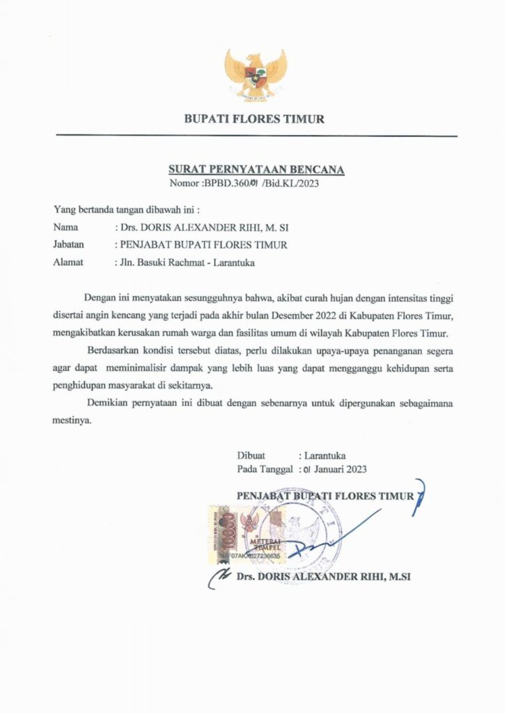 Dihimpun Lidik News. Com, Pelaksana Tugas Kepala Pelaksana (Kalak) Badan Penanggulangan Bencana Daerah (BPBD) Kabupaten Flores Timur, Eduard J. Fernandez, Rabu (04/01/23), mengatakan bahwa terhadap cuaca Extrem yang telah merusakan rumah warga dan Fasilitas Umum akan segera di sikapi oleh Pemda Flotim berdasarkan instruksi Bupati Flotim dengan nomor terlampir.
