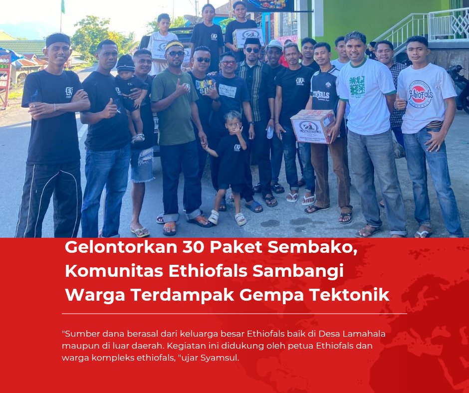 Koordinator Lapangan Saymsul RL menyampaikan bahwa keluarga besar Ethiofals membagi paket sembako di 30 Kepala Keluarga yang berada di Desa Lamahala Jaya Dusun 5 dan 6.