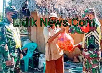 LIDIK NEWS.COM | FLOTIM - Anggota Koramil 1624-01/Larantuka bersama perangkat Desa Kolaka menyerahkan bantuan Sembako kepada Bapak Yohanes Seran Umur...